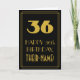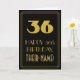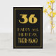 Este diseño de tarjeta de felicitación de cumpleaños de estilo inspirado en la era de 1920/1930 y estilo vintage/retro presenta un gran número "36" con apariencia art déco, el mensaje "FELIZ 36º CUMPLEAÑOS", un nombre personalizado y un patrón de borde que consiste en líneas delgadas en la parte delantera. El fondo de la parte delantera está coloreado de negro. El interior tiene un mensaje de felicitación de cumpleaños editable, o quizás podría ser borrado y dejado en blanco si se desea escribir un mensaje a mano en su lugar. Una tarjeta de felicitación de cumpleaños personalizable como esta podría ser enviada para celebrar el trigésimo sexto cumpleaños de alguien.