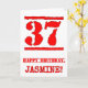 Este divertido diseño de tarjetas de felicitación con temática de cumpleaños presenta un gran número rojo "37" con un estilo inspirado en un sello de goma, además del mensaje de bienvenida de cumpleaños "FELIZ CUMPLEAÑOS", y un nombre personalizado en la parte delantera. El interior tiene un mensaje de bienvenida de cumpleaños de personalizado, o tal vez podría ser borrado y dejado en blanco si un mensaje se va a escribir a mano en su lugar. Una divertida tarjeta de felicitación de cumpleaños editable como esta podría ser usada para reconocer el cumpleaños treinta y siete de alguien. [~Z0000524]