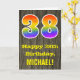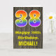 La parte delantera de este colorido pero rústico diseño de tarjetas de felicitación de cumpleaños presenta un gran número "38" con un diseño inspirado en el gradiente del espectro arcoiris. También incluye el mensaje "Feliz cumpleaños número 38", y un nombre de destinatario editable. En la parte delantera hay un fondo que representa un estilo rústico de grano de madera. El interior presenta un mensaje de bienvenida de cumpleaños personalizado, o tal vez podría ser borrado y dejado en blanco si se va a escribir un mensaje a mano. Una tarjeta de cumpleaños de personalizable como esta podría ser una manera divertida de celebrar el cumpleaños treinta y ocho de alguien. [~Z0000419]