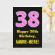 Esta divertida y alegre tarjeta de felicitación temática de cumpleaños presenta un gran número "38" con un patrón de rayas que contiene formas de corazón color rosa oscuro y rosa claro en la parte delantera. En la parte delantera también aparece el mensaje de bienvenida de cumpleaños "Feliz cumpleaños número 38", y un nombre de destinatario personalizado. El interior presenta un mensaje de bienvenida de cumpleaños de personalizable, o tal vez podría ser borrado y dejado en blanco si se va a escribir un mensaje a mano. Una tarjeta de cumpleaños de personalizable como esta podría ser una manera divertida de reconocer el cumpleaños treinta y ocho de alguien. También podría ser una elección divertida para alguien cuyo cumpleaños cae el 14 de febrero (El día de San Valentín), debido a sus adorables símbolos del corazón y colores. [~Z0000434]