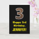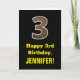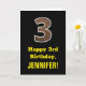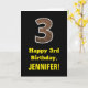 Esta divertida y rústica tarjeta de felicitación temática de cumpleaños presenta un gran número "3" con un patrón de apariencia inspirado en el grano de madera de imitación en la parte delantera. En la parte delantera también aparece el mensaje de bienvenida de cumpleaños "Feliz tercer cumpleaños", y un nombre de destinatario del personalizable. El interior presenta un mensaje de bienvenida de cumpleaños personalizado, o tal vez podría ser borrado y dejado en blanco si se va a escribir un mensaje a mano. Una tarjeta de cumpleaños personalizada como esta podría ser una manera divertida de reconocer el tercer cumpleaños de alguien. [~Z0000433]
