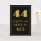 La parte delantera de este diseño de tarjetas de felicitación de cumpleaños de aspecto vintage presenta un gran estilo Art Déco inspirado en el número "44", el mensaje "FELIZ CUMPLEAÑOS 44", un nombre editable, y un patrón de borde formado por líneas. En el frente hay un fondo de color negro. El interior presenta un mensaje de bienvenida de cumpleaños de personalizado, o tal vez podría ser borrado y dejado en blanco si se va a escribir un mensaje a mano. Una tarjeta de cumpleaños de personalizable como esta podría ser una manera divertida de enviar un mensaje para celebrar el 44 cumpleaños de alguien. [~Z0000502]
