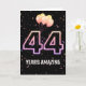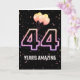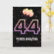 Globos fiestas y confeti sobre fondo negro con el neón número 44 por 44 años.