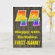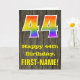 La parte delantera de este colorido pero rústico diseño de tarjetas de felicitación con temática de cumpleaños presenta un gran número "44" con un diseño inspirado en el gradiente del espectro arcoiris. También incluye el mensaje "Feliz cumpleaños número 44", y un nombre de destinatario personalizado. En la parte delantera hay un fondo que representa un estilo rústico de grano de madera. El interior presenta un mensaje de bienvenida de cumpleaños editable, o tal vez podría ser borrado y dejado en blanco si se va a escribir un mensaje a mano. Una tarjeta de cumpleaños de personalizable como esta podría ser una manera divertida de enviar un mensaje para celebrar el 44 cumpleaños de alguien. [~Z0000419]