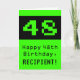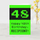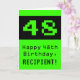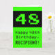 La parte delantera de este divertido y geeky diseño de tarjetas de felicitación con temática de cumpleaños cuenta con un gran estilo de videojuegos de época verde número "48". También incluye el mensaje de bienvenida de cumpleaños "Feliz 48 cumpleaños", y un nombre que puede ser editado. El interior presenta un mensaje de bienvenida de cumpleaños de personalizable, o tal vez podría ser borrado y dejado en blanco si se va a escribir un mensaje a mano. Una tarjeta de felicitación de cumpleaños tonta y nerviosa como esta podría ser usada para enviar un mensaje de felicitación de cumpleaños en honor al cuarenta y ocho cumpleaños de un científico, un administrador de sistemas informáticos o alguien a quien realmente le gusta el juego retro de computadora. [~Z0000430]