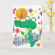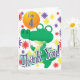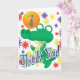 Un lagarto verde lindo sostiene un globo naranja con el texto que tengo en este cuarto cumpleaños sobre el diseño de la coordinación de camisetas del cuarto cumpleaños, botones, invitaciones a fiestas, notas de agradecimiento y franqueo.