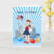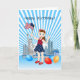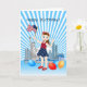 Estrellas y rayas en rojo, blanco y azul son los colores de la bandera estadounidense que inspiraron este diseño. Esta tarjeta de saludo es especialmente para niños que nacieron el 4 de julio o para cualquiera que desee celebrar el 4 de julio. El niño también está vestido con colores patrióticos mientras ondea una bandera estadounidense. Todo el texto es personalizable con tus detalles. Los globos coloridos también le dan un toque de celebración. En la parte trasera está la Estatua de la Libertad y el horizonte de los edificios. Los rayos azules festivos dan un sentido de movimiento a la composición.