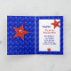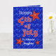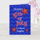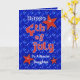 Estrellas rojas mullidas y estrellas rojas llenas de letras en un cielo azul lleno de luces de fuegos artificiales del Día de la Independencia es un divertido auto de saludo para tu hija, que es una estrella estadounidense. El texto se puede personalizar utilizando las plantillas proporcionadas. Arte original y diseño de Anura Design Studio.