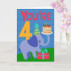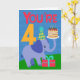 This is a cute fourth birthday card for either a boy or girl. It has a cute purple elephant with a number 4 on its back, a strawberry cake held by the trunk, a party hat on the head and a present under the foot.