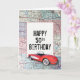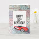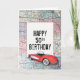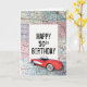 Coche retro de color rojo y blanco en una hoja de ruta por 50 años.