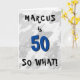50 entonces qué Cita divertida y nombre tarjeta de cumpleaños número 50 azul. Fondo abstracto gris con tipografía divertida en negro y azul. Una gran tarjeta de saludo inspiradora y divertida para hombres o mujeres, que celebra el 50 cumpleaños. Viene con una cita graciosa 50, así que qué, y es perfecto para una persona con sentido del humor - personaliza con tu nombre. Personalizar con tu mensaje dentro, deja o borra el texto.