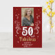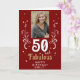 50 y Fabulous Foliage 50th Birthday Photo Card. 50 y texto fabuloso en escritura blanca a la moda con un nombre y follaje blanco sobre un fondo rojo. Personalízalo con tu foto, tu nombre y la edad. Agrega tu texto dentro de la tarjeta o borra.