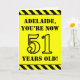 La parte delantera de este diseño de tarjetas de felicitación con temática de cumpleaños audaz presenta un nombre personalizado y el mensaje "YA TIENES 51 AÑOS DE EDAD!" en un texto de estilo esténcil negro con fondo amarillo. También hay un llamativo patrón de rayas negras y amarillas en los bordes superior e inferior de la parte delantera. El interior presenta un mensaje de bienvenida de cumpleaños de personalizable, o tal vez podría ser borrado y dejado en blanco si se va a escribir un mensaje a mano. Una tarjeta de cumpleaños personalizada como esta podría ser una manera divertida de enviar deseos de cumpleaños a alguien que está celebrando su primer cumpleaños. [~Z0000413]