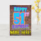 La parte delantera de este divertido diseño de tarjetas de felicitación de cumpleaños incluye el mensaje "FELIZ 51º CUMPLEAÑOS", con un aspecto vibrante, colorido e inspirado en el graffiti, además de un nombre personalizado para el destinatario. El fondo del frente está decorado con una pared de ladrillo. El interior tiene un mensaje de bienvenida de cumpleaños personalizado, o tal vez podría ser borrado y dejado en blanco si se va a escribir un mensaje a mano. Una tarjeta de felicitación de cumpleaños divertida y personalizada como esta podría ser usada para reconocer el 51 cumpleaños de alguien. [~Z0000531]