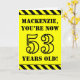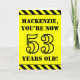 La parte delantera de este divertido diseño de tarjetas de felicitación con temática de cumpleaños incluye un nombre personalizado y el mensaje "¡YA TIENES 53 AÑOS!" en un texto de estilo esténcil negro sobre un fondo amarillo. También hay un llamativo patrón rayado negro y amarillo en los bordes superior e inferior de la parte delantera. El interior presenta un mensaje de bienvenida de cumpleaños personalizado, o tal vez podría ser borrado y dejado en blanco si se va a escribir un mensaje a mano. Una tarjeta de cumpleaños personalizado como esta podría ser una manera divertida de enviar deseos de cumpleaños a alguien que esté celebrando su cincuenta y tres años. [~Z0000413]