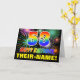 La parte delantera de este colorido, alegre y divertido diseño de tarjetas de felicitación de cumpleaños tiene un gran número "53" y el mensaje "FELIZ CUMPLEAÑOS", ambos coloreados con un patrón inspirado en el gradiente del espectro del arcoiris, junto con un nombre de destinatario negrita amarillo personalizado. El frente también presenta un patrón de fondo inspirado en fuegos artificiales de celebración reventados multicolor. El interior presenta un mensaje de bienvenida de cumpleaños personalizado, o tal vez podría ser borrado y dejado en blanco si se va a escribir un mensaje a mano. Una alegre tarjeta de cumpleaños de personalizable como esta podría ser una manera divertida de celebrar los cincuenta y tres años de alguien. [~Z0000471]