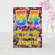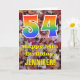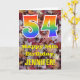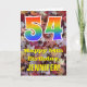 La parte delantera de este colorido, rústico y de diseño de tarjetas de felicitación de cumpleaños con temática otoñal cuenta con un gran número "54" con un diseño inspirado en el gradiente del espectro arcoiris. También incluye el mensaje "Feliz cumpleaños número 54", y un nombre personalizado. El fondo de la parte delantera de la tarjeta presenta un patrón rústico de hojas de otoño caídas. El interior presenta un mensaje de bienvenida de cumpleaños editable, o tal vez podría ser borrado y dejado en blanco si se va a escribir un mensaje a mano. Una tarjeta de cumpleaños de personalizable como esta podría ser una manera divertida de enviar un mensaje para celebrar el cincuenta y cuarto cumpleaños de alguien. [~Z0000384]