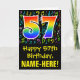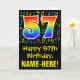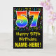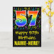 El frente de este divertido, colorido y vibrante diseño de tarjetas de felicitación con temática de cumpleaños presenta un gran número "57" con un patrón inspirado en el gradiente del espectro del arcoiris, junto con el mensaje "Feliz cumpleaños número 57", y un nombre de destinatario personalizado. El frente también tiene notas musicales coloridas y patrones de símbolos. El interior presenta un mensaje de bienvenida de cumpleaños de personalizado, o tal vez podría ser borrado y dejado en blanco si se va a escribir un mensaje a mano. Una tarjeta de cumpleaños de personalizable como esta podría ser una manera divertida de enviar un mensaje en celebración de los cincuenta y siete años de alguien. [~Z0000420]