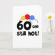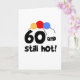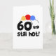 Globos de los colores primarios y texto negro que lee "60 y aún caliente!" ¡en las 60.as camisetas del cumpleaños, las tazas, los botones, las tarjetas, y el otro engranaje del cumpleaños!