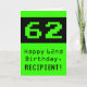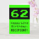 Este diseño de tarjeta de felicitación temática geek y divertido para el cumpleaños incluye un gran juego de ordenador retro verde de estilo número "62" en la parte delantera. También incluye el mensaje de bienvenida de cumpleaños "Feliz cumpleaños número 62", y un nombre que puede ser personalizado. El interior presenta un mensaje de bienvenida de cumpleaños de personalizable, o tal vez podría ser borrado y dejado en blanco si se va a escribir un mensaje a mano. Una divertida tarjeta de felicitación de cumpleaños como esta podría ser usada para enviar un mensaje de felicitación de cumpleaños en honor al sexagésimo segundo cumpleaños de un historiador de computación, un científico o alguien que aprecia los videojuegos de computadora de época. [~Z0000430]