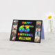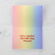 La parte delantera de este divertido y alegre diseño de tarjetas de felicitación con temática de cumpleaños incluye el mensaje "FELIZ 63º CUMPLEAÑOS", con un patrón de gradiente inspirado en el espectro multicolor, junto con un nombre de destinatario personalizado. A la izquierda y a la derecha del mensaje con motivos de arco iris en el frente hay algunas fotos que se pueden personalizar, tal vez con fotos del destinatario, la familia y amigos del destinatario, y/o el(los) remitente(s) de la tarjeta. El interior presenta un mensaje de bienvenida de cumpleaños personalizado, o tal vez podría ser borrado y dejado en blanco si se va a escribir un mensaje a mano. Una tarjeta de felicitación audaz y personalizada de cumpleaños como esta podría ser usada para reconocer el cumpleaños sesenta y tres de alguien. (Fotografía © Storytree Studios, Stanford, CA.) [~Z0000667]