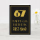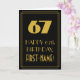 Esta apariencia vintage/retro y el diseño inspirado de la tarjeta de felicitación temática de la era de los locos 2000 presentan una gran apariencia Art Déco inspirada en el número "67", el mensaje "FELIZ 67 BIRTHDAY", un nombre de personalizable, y un patrón fronterizo consistente en líneas delgadas en el frente. El frente tiene un fondo de color negro. El interior tiene un mensaje personalizado de bienvenida de cumpleaños, o tal vez podría ser borrado y dejado en blanco si se va a escribir un mensaje a mano. Una tarjeta de felicitación de cumpleaños editable como esta podría ser enviada para celebrar el cumpleaños sesenta y siete de alguien. [~Z0000499]