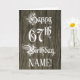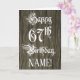 La parte delantera de este elegante y elegante diseño de tarjetas de felicitación de cumpleaños muestra el mensaje "Feliz cumpleaños número 67", en un texto ornamentado de escritura. En la parte delantera también hay un nombre personalizado para el destinatario y un patrón de fondo inspirado en la madera falsa. El interior tiene un mensaje de bienvenida de cumpleaños personalizado, o tal vez podría ser borrado y dejado en blanco si se va a escribir un mensaje a mano. Una elegante y personalizada tarjeta de felicitación de cumpleaños como esta puede ser enviada para celebrar el cumpleaños sesenta y siete de alguien. [~Z0000556]