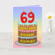 Esta divertida y colorida tarjeta de felicitación temática de cumpleaños presenta una representación al estilo personalizado de una torta de cumpleaños de tres niveles que tiene velas en forma de numeral en la parte superior que muestran el número "69", junto con el mensaje "FELIZ CUMPLEAÑOS 69", y un nombre de destinatario personalizado. El fondo de la parte delantera tiene un diseño multicolor de gradiente inspirado en el espectro arcoiris pastel. El interior tiene un mensaje de bienvenida de cumpleaños personalizado, o tal vez podría ser borrado y dejado en blanco si se va a escribir un mensaje a mano. Una tarjeta de felicitación alegre y de personalizable como esta puede ser una manera divertida de dar saludos de cumpleaños a alguien que está celebrando su sexagésimo noveno cumpleaños. [~Z0000625]