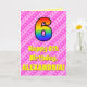 La parte delantera de este animado y divertido diseño de tarjetas de felicitación temáticas de 6º cumpleaños presenta un gran número "6" con un colorido patrón de gradiente inspirado en el espectro arcoiris. También incluye el mensaje "Feliz sexto cumpleaños", y un nombre de destinatario personalizado. El fondo de la parte delantera está decorado con rayas rosa claro y rosa oscuro que contienen formas cariñosas de corazón rosado. El interior presenta un mensaje de bienvenida de cumpleaños personalizado, o tal vez podría ser borrado y dejado en blanco si se va a escribir un mensaje a mano. Una tarjeta de cumpleaños personalizada como esta podría ser una manera divertida de enviar un mensaje para celebrar el sexto cumpleaños de alguien. [~Z0000416]