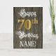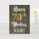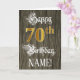 La parte delantera de este adorable y elegante diseño de tarjetas de felicitación con temática de cumpleaños incluye el mensaje "Feliz cumpleaños número 70", junto con un nombre de destinatario personalizado. Parte del mensaje está en un texto elaborado estilo script. El gran número 70 presenta un estilo de imitación dorado. El fondo tiene un patrón imitación/falso inspirado en el grano de madera. El interior tiene un mensaje personalizado de bienvenida de cumpleaños, o tal vez podría ser borrado y dejado en blanco si se va a escribir un mensaje a mano. Una elegante y personalizada tarjeta de felicitación de cumpleaños como esta podría ser usada para reconocer el septuagésimo cumpleaños de alguien. [~Z0000561]