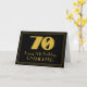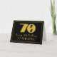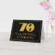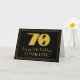 El diseño de esta tarjeta de felicitación inspirada en la época de los locos años veinte presenta un gran estilo Art Déco inspirado en el número "70", el mensaje "Feliz cumpleaños 70", un nombre personalizado y un patrón de frontera que consiste en líneas delgadas en el frente. El fondo del frente es negro de color. El interior tiene un mensaje personalizado de bienvenida de cumpleaños, o tal vez podría ser borrado y dejado en blanco si se va a escribir un mensaje a mano. Una tarjeta de felicitación personalizada de cumpleaños como esta podría ser usada para reconocer el septuagésimo cumpleaños de alguien. [~Z0000498]