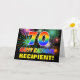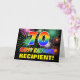 La parte delantera de este alegre, colorido y divertido diseño de tarjetas de felicitación de cumpleaños tiene un gran número "70" y el mensaje "FELIZ CUMPLEAÑOS", ambos coloreados con un patrón inspirado en el gradiente del espectro del arcoiris, junto con un nombre de destinatario negrita amarillo personalizado. El frente también tiene un patrón de fondo multicolor inspirado en fuegos artificiales de celebración reventando. El interior presenta un mensaje de bienvenida de cumpleaños editable, o tal vez podría ser borrado y dejado en blanco si se va a escribir un mensaje a mano. Una vibrante tarjeta de cumpleaños personalizada como esta podría ser una manera divertida de enviar un mensaje celebrando el septuagésimo cumpleaños de alguien. [~Z0000471]