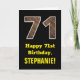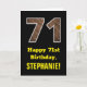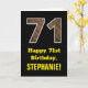 Esta divertida y rústica tarjeta de felicitación temática de cumpleaños presenta un gran número "71" con un falso diseño inspirado en granos de madera en la parte delantera. En la parte delantera también aparece el mensaje de bienvenida de cumpleaños "Feliz cumpleaños número 71", y un nombre de destinatario personalizado. El interior presenta un mensaje de bienvenida de cumpleaños personalizado, o tal vez podría ser borrado y dejado en blanco si se va a escribir un mensaje a mano. Una tarjeta de cumpleaños como esta puede ser una manera divertida de enviar deseos de cumpleaños a alguien que está celebrando su cumpleaños setenta y uno. [~Z0000433]