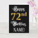 La parte delantera de este elaborado y lujoso diseño de tarjetas de felicitación con temática de cumpleaños incluye el mensaje "Feliz cumpleaños número 72", más un nombre de destinatario de personalizable. Parte del mensaje está en un texto elegante estilo script, el gran número "72nd" presenta un patrón de aspecto falso/imitación de inspiración dorada, y el fondo es negro de color. El interior tiene un mensaje de bienvenida de cumpleaños personalizado, o tal vez podría ser borrado y dejado en blanco si se va a escribir un mensaje a mano. Una tarjeta de felicitación formal y personalizada de cumpleaños como esta podría ser una manera respetable de enviar saludos de cumpleaños a alguien que está celebrando su cumpleaños número setenta y dos. [~Z0000559]