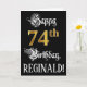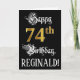 La parte delantera de este elegante y formal diseño de tarjetas de felicitación temática de cumpleaños incluye el mensaje "Feliz cumpleaños 74", y un nombre de destinatario personalizado. Parte del mensaje está en un texto con estilo de script ornamentado. El gran número 74th presenta un estilo de imitación dorado. El fondo es negro de color. El interior tiene un mensaje de bienvenida de cumpleaños de personalizado, o tal vez podría ser borrado y dejado en blanco si un mensaje se va a escribir a mano en su lugar. Una elaborada y editable tarjeta de felicitación de cumpleaños como esta podría ser enviada para celebrar el cumpleaños setenta y cuatro de alguien. [~Z0000559]