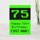Este diseño de tarjetas de felicitación de cumpleaños geek y nerdy presenta un gran estilo de videojuegos verde "75" en la parte delantera. También incluye el mensaje de bienvenida de cumpleaños "Feliz cumpleaños número 75", y un nombre personalizado. El interior presenta un mensaje de bienvenida de cumpleaños personalizado, o tal vez podría ser borrado y dejado en blanco si se va a escribir un mensaje a mano. Una tarjeta de felicitación de cumpleaños divertida y nerd como esta podría ser usada para reconocer el cumpleaños de un científico, un historiador de computación, o alguien que disfruta del juego de computadora de 8 bits y que está celebrando su cumpleaños setenta y cinco. [~Z0000430]