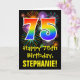 El frente de este colorido, emocionante y divertido diseño de tarjetas de felicitación con temática de cumpleaños presenta un gran número "75" con un patrón inspirado en el gradiente del espectro del arco iris, junto con el mensaje "Feliz cumpleaños número 75", y un nombre de destinatario personalizado. El frente también presenta un colorido estallido de fuegos artificiales de celebración inspirados en el patrón de fondo. El interior presenta un mensaje de bienvenida de cumpleaños de personalizado, o tal vez podría ser borrado y dejado en blanco si se va a escribir un mensaje a mano. Una tarjeta de cumpleaños personalizada como esta podría ser una manera divertida de enviar un mensaje en celebración de los setenta y cinco años de alguien. [~Z0000442]