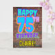 La parte delantera de este divertido diseño de tarjetas de felicitación de cumpleaños incluye el mensaje "FELIZ CUMPLEAÑOS 75″, con un aspecto vibrante, colorido e inspirado en el graffiti, junto con un nombre editable del destinatario. El fondo del frente está decorado con una pared de ladrillo. El interior tiene un mensaje de saludo de cumpleaños modificable, o tal vez podría ser borrado y dejado en blanco si se va a escribir un mensaje a mano. Una divertida y editable tarjeta de felicitación de cumpleaños como esta podría ser usada para celebrar el cumpleaños setenta y cinco de alguien. [~Z0000531]