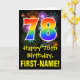 El frente de este emocionante, divertido y colorido diseño de tarjetas de felicitación temáticas de cumpleaños presenta un gran número "78" con un patrón inspirado en el gradiente del espectro arcoiris. También incluye el mensaje "Feliz cumpleaños número 78", y un nombre de destinatario personalizado. El frente también presenta un colorido estallido de fuegos artificiales de celebración inspirados en el patrón de fondo. El interior presenta un mensaje de bienvenida de cumpleaños de personalizable, o tal vez podría ser borrado y dejado en blanco si se va a escribir un mensaje a mano. Una tarjeta de cumpleaños de personalizable como esta podría ser una manera divertida de celebrar el cumpleaños setenta y ocho de alguien. [~Z0000442]