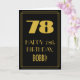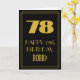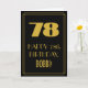El diseño de esta tarjeta de felicitación de cumpleaños inspirada en el estilo de la época de los años 20-30 y estilo vintage/retro presenta una gran apariencia Art Deco inspirada en el número "78", el mensaje "FELIZ CUMPLEAÑOS 78", un nombre de personalizable y un patrón fronterizo consistente en líneas delgadas en el frente. El frente presenta un fondo de color negro. El interior tiene un mensaje de bienvenida de cumpleaños de personalizable, o tal vez podría ser borrado y dejado en blanco si un mensaje se va a escribir a mano en su lugar. Una tarjeta de felicitación de cumpleaños de personalizable como esta podría ser usada para celebrar el cumpleaños setenta y ocho de alguien. [~Z0000499]