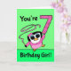 ¡Nuestro pequeño amigo pingüino le desea a una gimnasta especial un feliz séptimo cumpleaños! Está actuando en su leotardo rosa con cinta y balanceando un gran confeti rosado número 7. El fondo de la tarjeta es un verde divertido. Ilustracion original de Bethany J. Mitchell de Darcy Place Studio.
