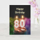Una torta de torta de cumpleaños con velas. Las velas están compuestas por el número 80, por 80 años. Una tarjeta de cumpleaños para todos.