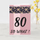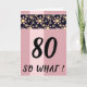 80 Así que Qué Tarjeta de Cumpleaños Floral Rosa Divertida para Ella. La tarjeta es rosa y tiene una franja con un patrón de flores rosas y amarillas sobre fondo negro. Viene con una cita divertida y motivadora 80 así que qué, y es perfecta para una persona con sentido del humor. Cambia el número de edad y personaliza el mensaje y los nombres dentro o elimínalo.