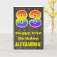 La parte delantera de este colorido pero rústico diseño de tarjetas de felicitación temática de cumpleaños presenta un gran número "83" con un patrón inspirado en el gradiente del espectro arcoiris, junto con el mensaje "Feliz cumpleaños número 83", y un nombre del destinatario del personalizable. El fondo de la parte delantera de la tarjeta está decorado con un estilo rústico de grano de madera falsa. El interior presenta un mensaje de bienvenida de cumpleaños de personalizable, o tal vez podría ser borrado y dejado en blanco si se va a escribir un mensaje a mano. Una tarjeta de cumpleaños como esta podría ser una manera divertida de enviar deseos de cumpleaños a alguien que esté celebrando su ochenta y tres cumpleaños. [~Z0000419]