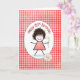 Chica de palo con pelo, gafas rojas, vestido de gingham y dásidos en un patrón de gingham rojo y blanco por 85 años. Se puede cambiar el número de edad.