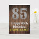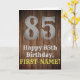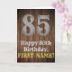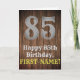 El diseño de la tarjeta de felicitación de cumpleaños inspirado en el viejo oeste de Estados Unidos presenta un gran estilo rústico con el número "85", el mensaje "Feliz cumpleaños 85", un nombre personalizado, y un diseño inspirado en el diseño de un patrón inspirado en la imitación de granos de madera. El interior tiene un mensaje personalizado de bienvenida de cumpleaños, o tal vez podría ser borrado y dejado en blanco si se va a escribir un mensaje a mano. Una tarjeta de felicitación personalizada de cumpleaños como esta podría ser usada para reconocer el cumpleaños ochenta y cinco de alguien. [~Z0000469]