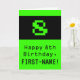 La parte delantera de este divertido y nerd diseño de tarjetas de felicitación con temática de cumpleaños cuenta con un gran estilo de videojuegos clásico verde "8". También incluye el mensaje de bienvenida de cumpleaños "Feliz octavo cumpleaños", y un nombre personalizado. El interior presenta un mensaje de bienvenida de cumpleaños personalizado, o tal vez podría ser borrado y dejado en blanco si se va a escribir un mensaje a mano. Una célebre tarjeta de cumpleaños como esta puede ser una manera divertida de enviar deseos de cumpleaños a alguien que está celebrando su octavo cumpleaños. [~Z0000430]