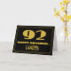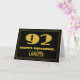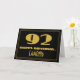 El diseño de esta tarjeta de felicitación con temática de cumpleaños de estilo vintage presenta un gran estilo Art Déco inspirado en el número "92", el mensaje "FELIZ CUMPLEAÑOS", un nombre personalizado y un patrón de borde formado por líneas. En la parte delantera también hay un fondo de color negro. El interior presenta un mensaje de bienvenida de cumpleaños editable, o tal vez podría ser borrado y dejado en blanco si se va a escribir un mensaje a mano. Una tarjeta de cumpleaños como esta puede ser una manera divertida de enviar deseos de cumpleaños a alguien que está celebrando su cumpleaños noventa. [~Z0000506]