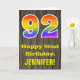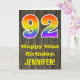 La parte delantera de este colorido pero rústico diseño de tarjetas de felicitación de cumpleaños presenta un gran número "92" con un diseño inspirado en el gradiente del espectro arcoiris. También incluye el mensaje "Feliz cumpleaños número 92", y un nombre de destinatario personalizado. En la parte delantera hay un fondo que representa un estilo rústico de imitación de grano de madera. El interior presenta un mensaje de bienvenida de cumpleaños personalizado, o tal vez podría ser borrado y dejado en blanco si se va a escribir un mensaje a mano. Una tarjeta de cumpleaños personalizada como esta podría ser una manera divertida de celebrar el cumpleaños noventa de alguien. [~Z0000419]