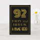 El frente de este diseño de tarjeta de felicitación de cumpleaños con apariencia inspirada en la década de 1920/1930 y vintage presenta un gran número "92" de estilo Art Deco, el mensaje "FELIZ 92º CUMPLEAÑOS", un nombre personalizado y un patrón de borde que consiste en líneas. El interior presenta un mensaje de felicitación de cumpleaños personalizado, o quizás podría estar en blanco si se desea escribir un mensaje a mano en su lugar. Una tarjeta de cumpleaños personalizada como esta podría ser una forma divertida de enviar deseos de cumpleaños a alguien que está celebrando su cumpleaños número noventa y dos. [~Z0000394]